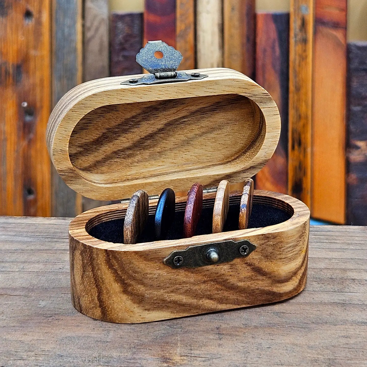 Wood Guitar Pick Box with 5 Wooden Picks – Handmade Guitar Accessory Gift